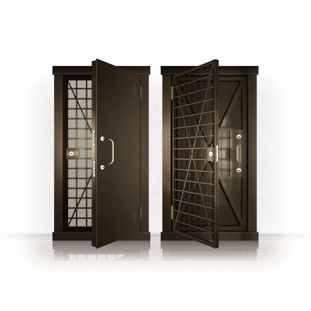 Металлические двери КХО и КХН представляют собой входные блоки, обладающие высоким уровнем взломостойкости и состоят из трех основных элементов: усиленного каркаса, сплошного металлического полотна и решетчатой двери. Дверной блок изготавливается из стального уголка 100*100 мм. Места крепления блока к стене цементируются и закрываются стальными наличниками шириной 40 мм. Крепеж заходит вглубь стены на 80 мм. В конструкции внешней створки монтируются ребра жесткости, для обшивки используется сталь толщиной не менее 3 мм. Внутренняя решетка изготавливается из прутка диаметром 16 мм. Размер ячеек решетки должен составлять не более 15 на 15 см. В точках пересечения прутья надежно приваривают друг к другу. В КХО и КХН необходимо поддерживать определенную температуру и влажность. Для этого внутреннее пространство глухой двери заполняется теплоизоляционным материалом, а по периметру двери приклеивается уплотнитель. Такие двери оборудуются замками с повышенным уровнем взломостойкости. Специализированные двери КХО и КХН в Емве могут быть оснащены сигнализацией, в конструкции могут быть проушины для навесного замка и элементами для опечатывания. Если идет речь о двери в комнату хранения оружия, в створке оборудуется окно для выдачи оружия и спец. средств, которое накрывается стальной дверцей.